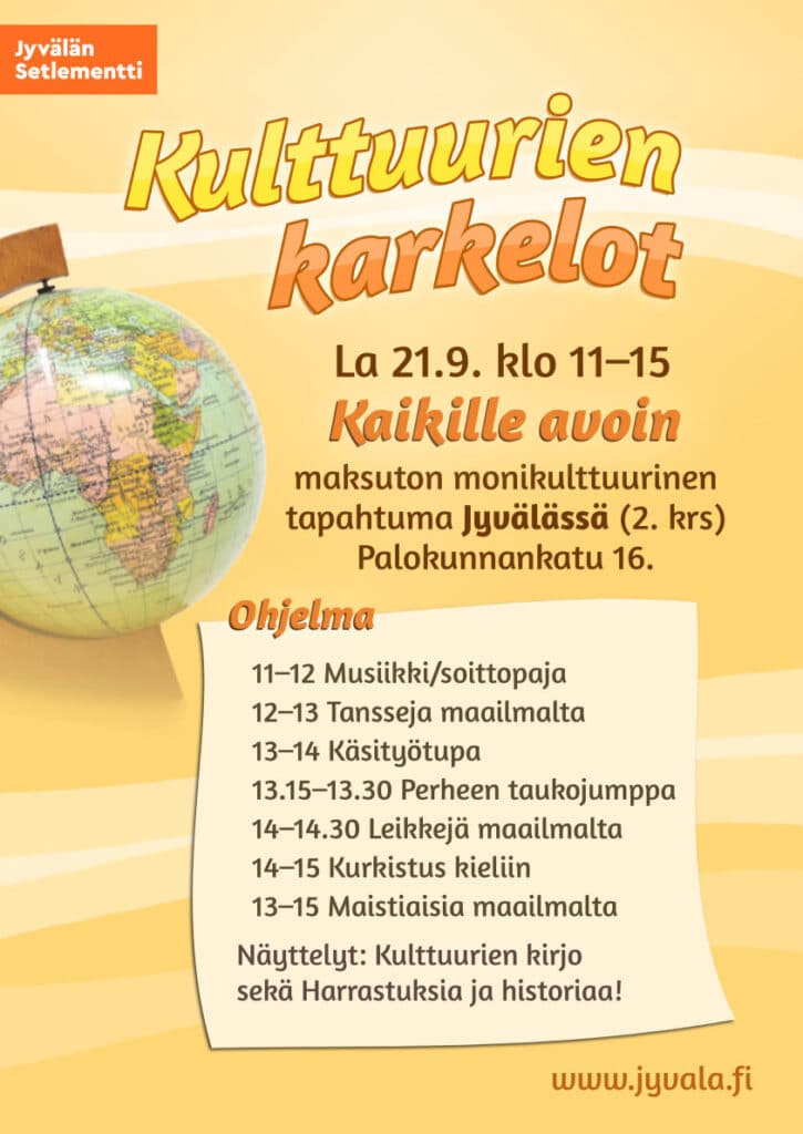 Lauantaina 21.9. Jyvälässä järjestetään kaikille avoin ja maksuton monikulttuurinen tapahtuma Kulttuurien karkelot. Saat tutustua erilaisiin kulttuureihin ja halutessasi osallistua myös paikalla järjestettäviin aktiviteetteihin. Lisäksi nähtävillä ovat näyttelyt Kulttuurien kirjo sekä Harrastuksia ja historiaa. Tule haistelemaan tunnelmaa ja viettämään yhdessä vaikka koko päivä!
