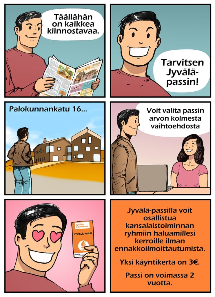 Jyvälä-passilla voit osallistua kansalaistoiminnan ryhmiin haluamillesi kerroille ilman ennakkoilmoittautumista. Passin voi käydä hakemassa Jyvälän toimistosta ja siitä lähetetään lasku kotiin. Jyvälä-passia on myynnissä 12 euron, 24 euron ja 36 euron arvoisena.